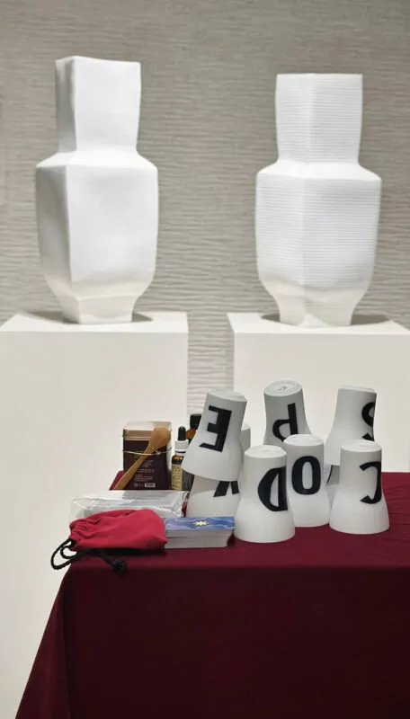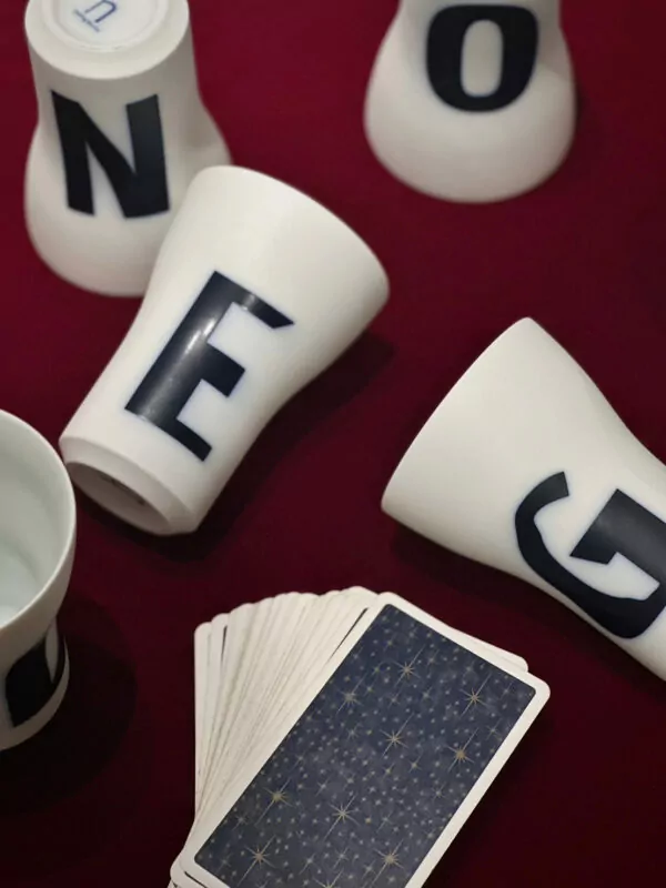 在這寬合藝所的神話微醺之夜,透過塔羅占卜師的引導,貴賓們都得到了一個專屬自己的神祕幸運符號,每個英文字母、每個數字,都擁有著象徵意義,如:A象徵智慧和溝通、F象徵財富和繁榮、S象徵太陽和勝利……等,而「說說杯 Lttter Cups」便將這樣的符號具象化於杯子上,人們在日常頻繁的使用之下,能使幸運符號的祝福力量更加顯著,在覺察自我感知的同時,也能感受到宇宙給予的友善邀約,於是,所有生命中美好的人事物將會串連在一起。