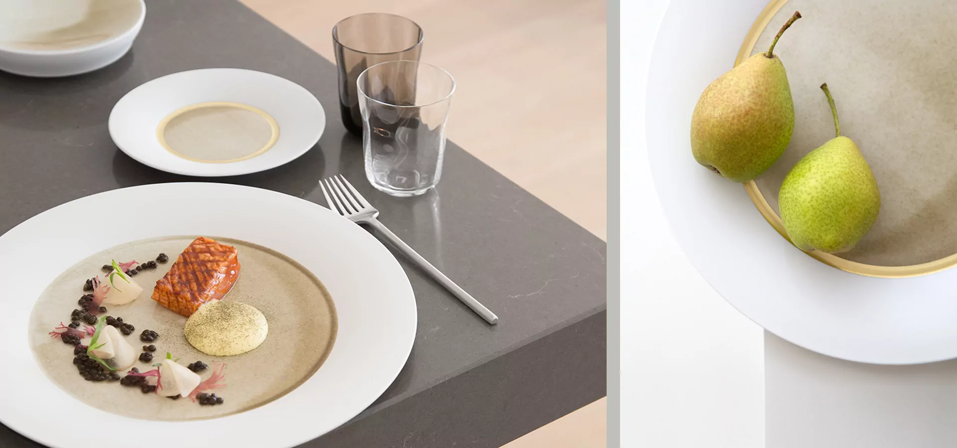 以特殊釉料鋪灑在碗盤上釉之處,在道道加溫程序中,讓釉料自由流淌,因而成就了每片餐瓷都會有不同的墨色,沉澱的深淺、平均度也有所不同。